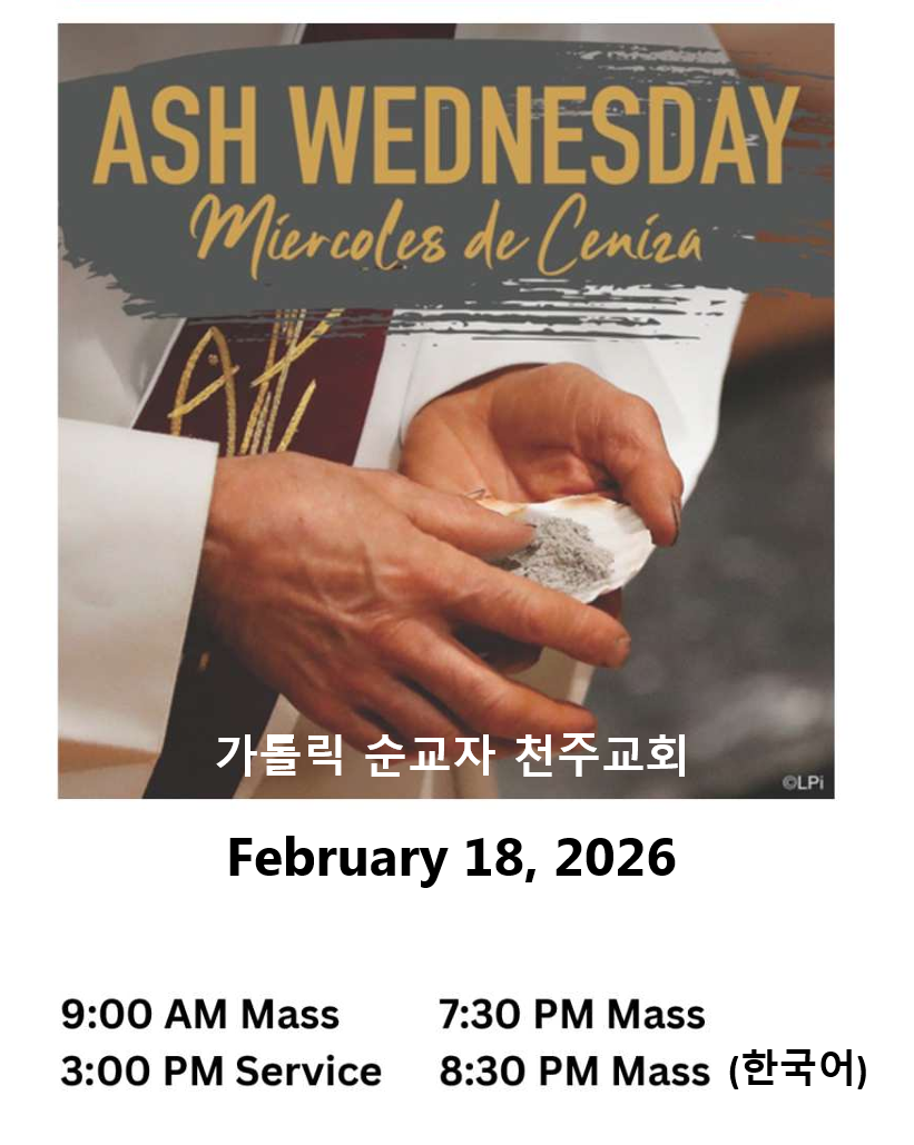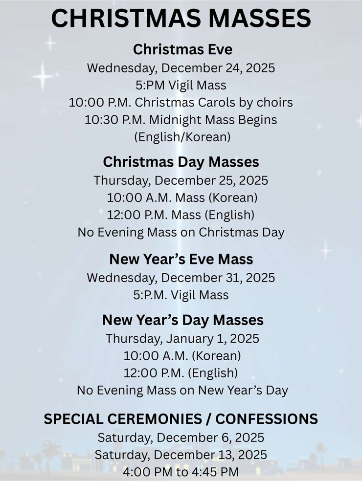 Sun 9:15 AM (Korean Mass), 11:00 AM (English Mass)